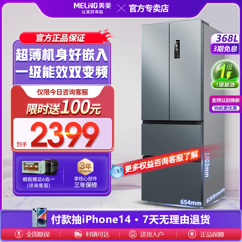美菱368L法式多门四门双开门小型电冰箱风冷无霜纤薄变频一级节能