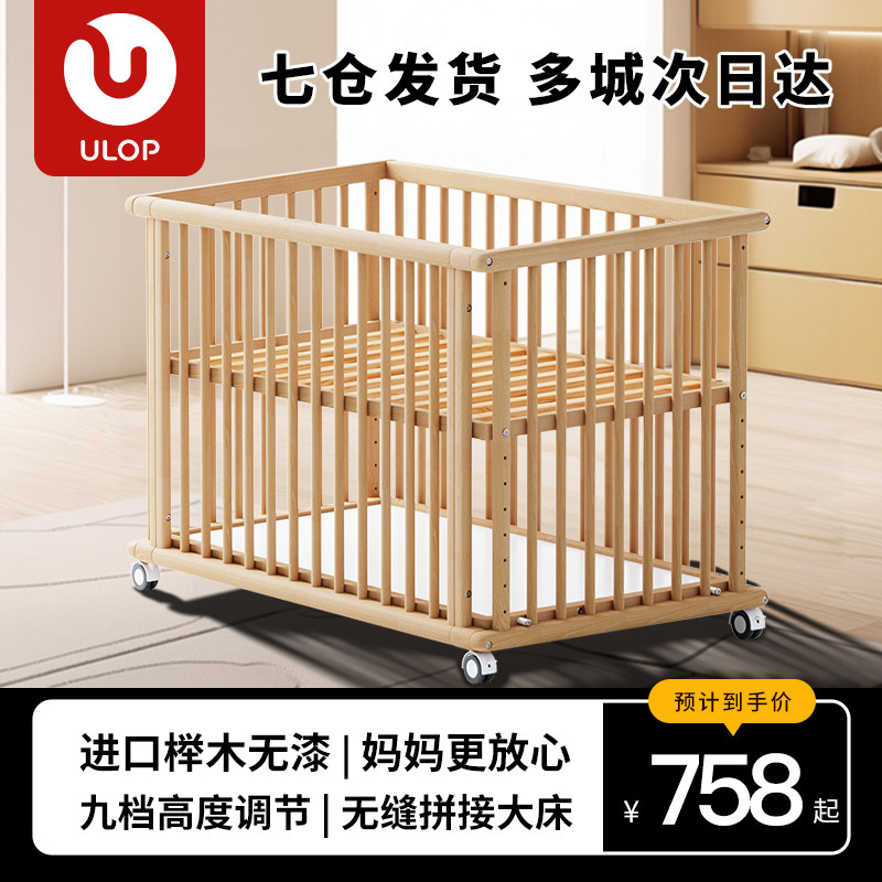 券 50元销量100ULOP优乐博榉木婴儿床可拼接移动床宝宝新生儿童床全实木调节高度