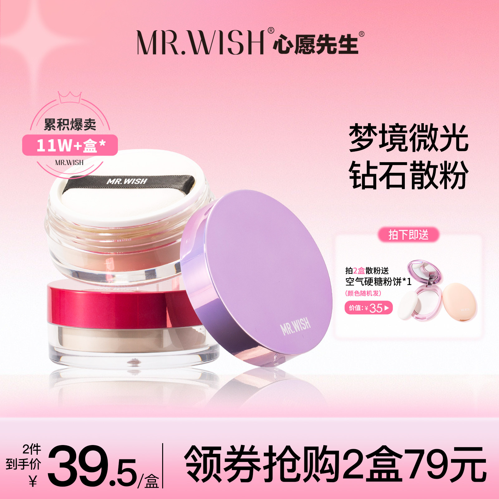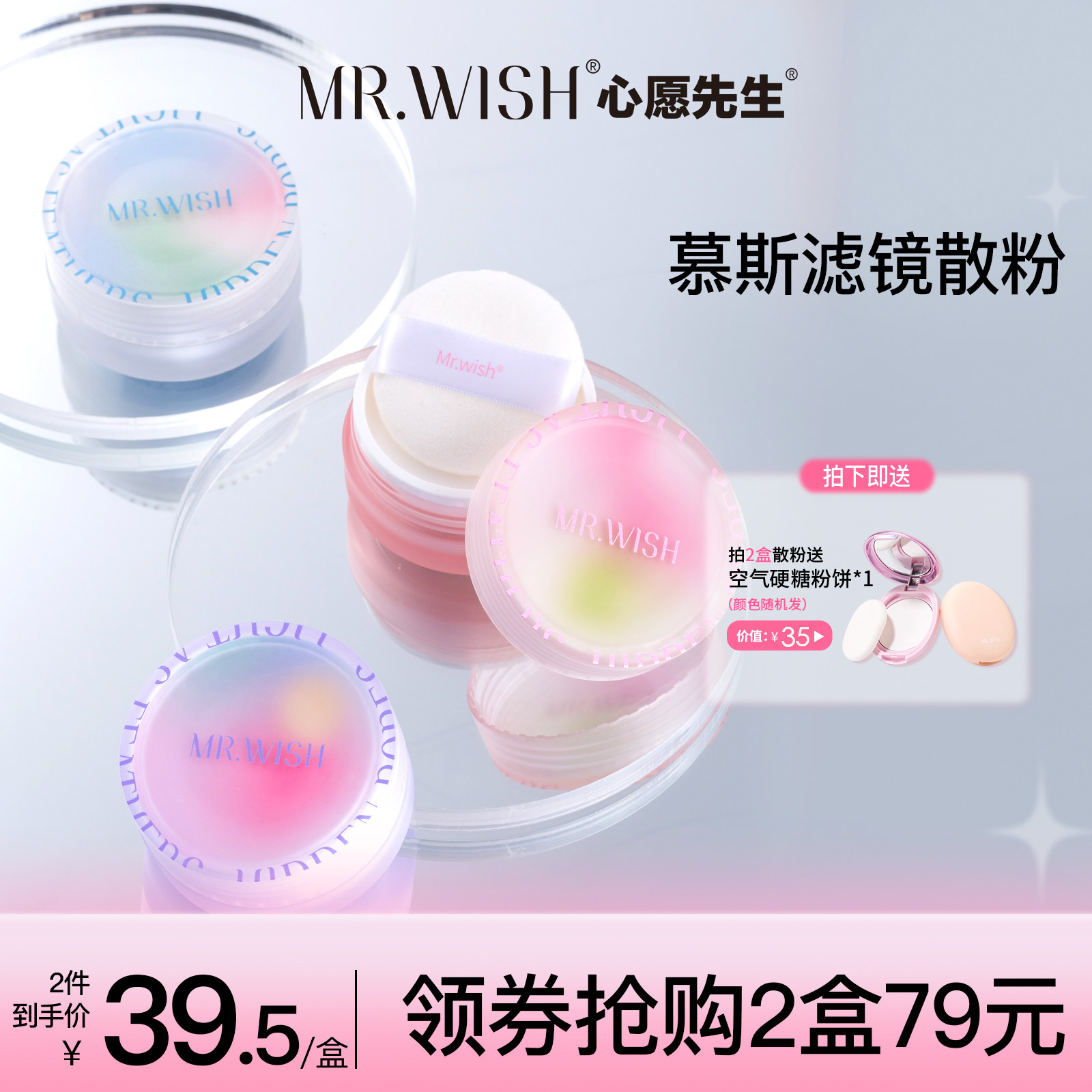 券 50元销量400Mr.wish/心愿先生散粉梦境微闪珠光持久定妆粉扑控油防水蜜粉女