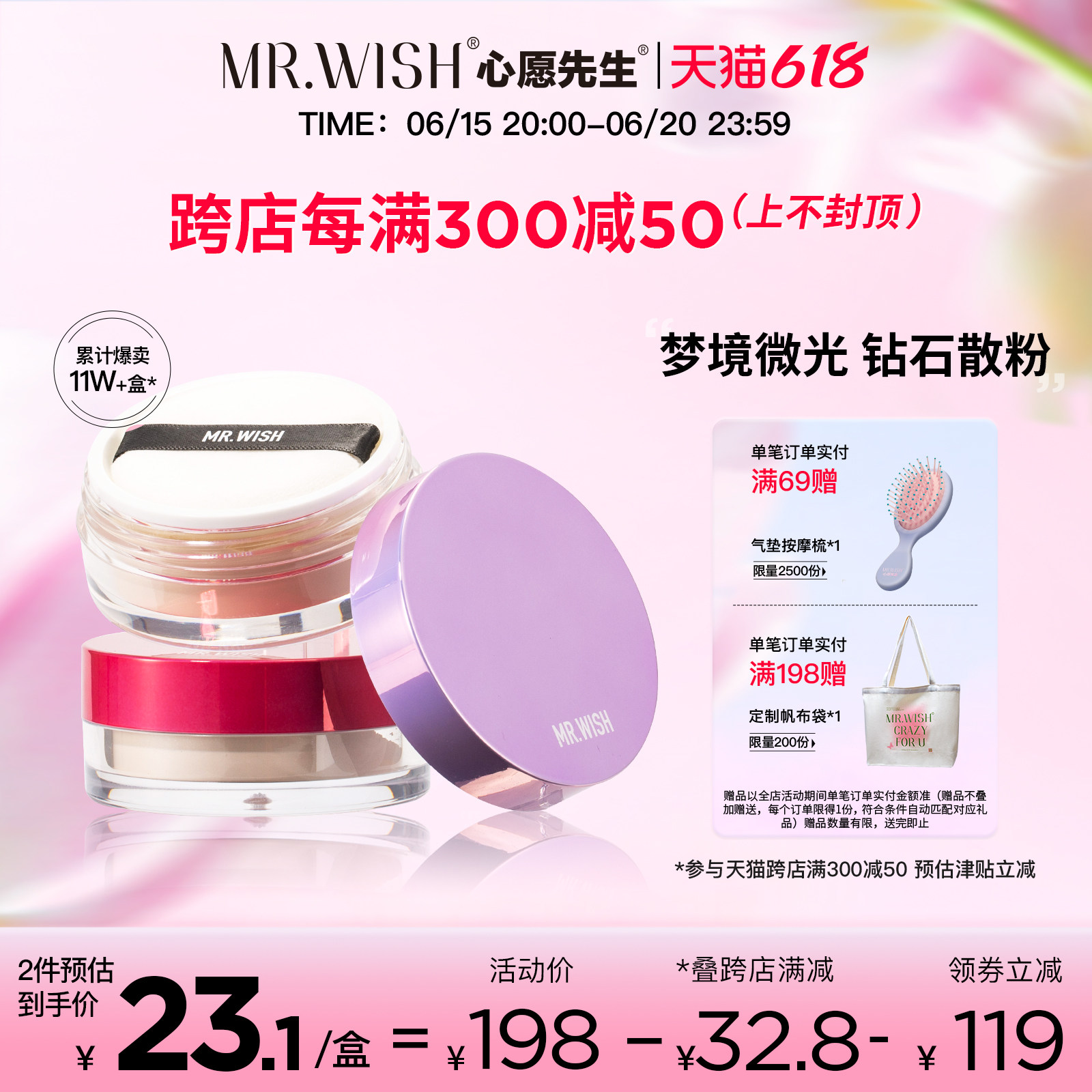 券 50元销量300Mr.wish/心愿先生散粉梦境微闪珠光持久定妆粉扑控油防水蜜粉女