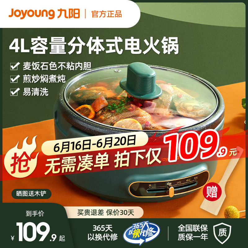 九阳电火锅家用分体式电煮锅多功能电炒锅可拆洗不粘煎炒电热锅4L