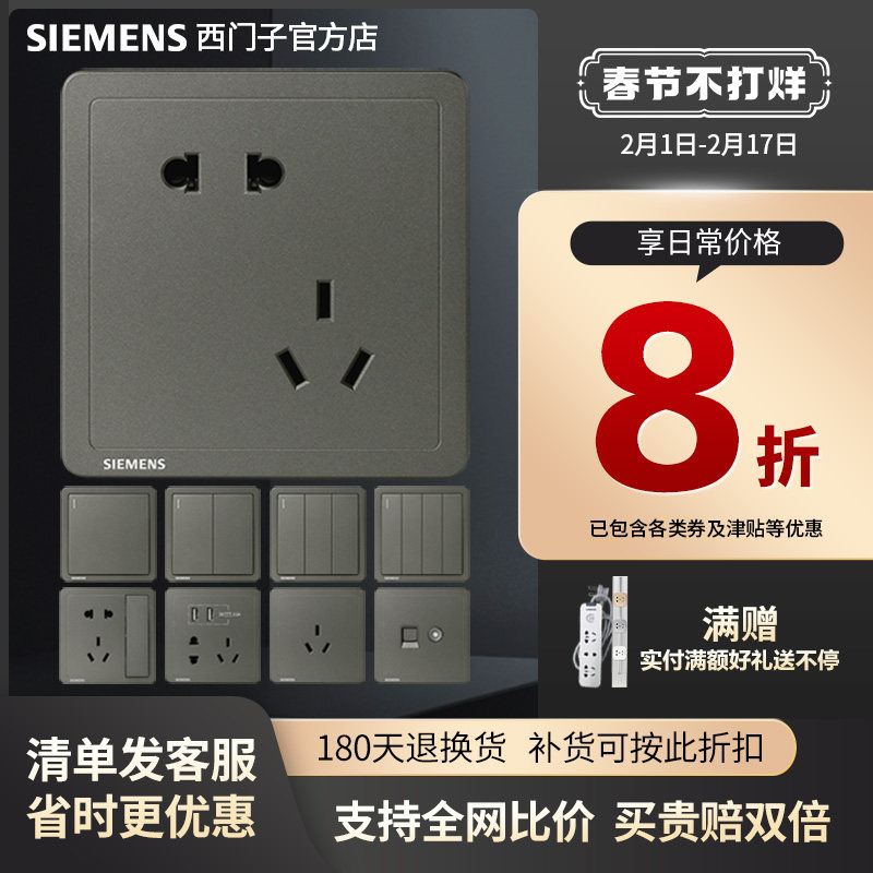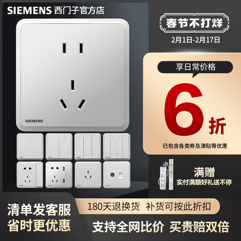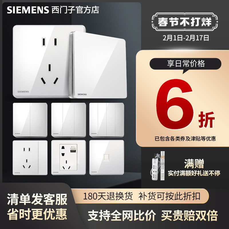 券 2元销量10西门子灵蕴开关插座面板白色86型家用五孔单开16a暗装usb全屋套餐