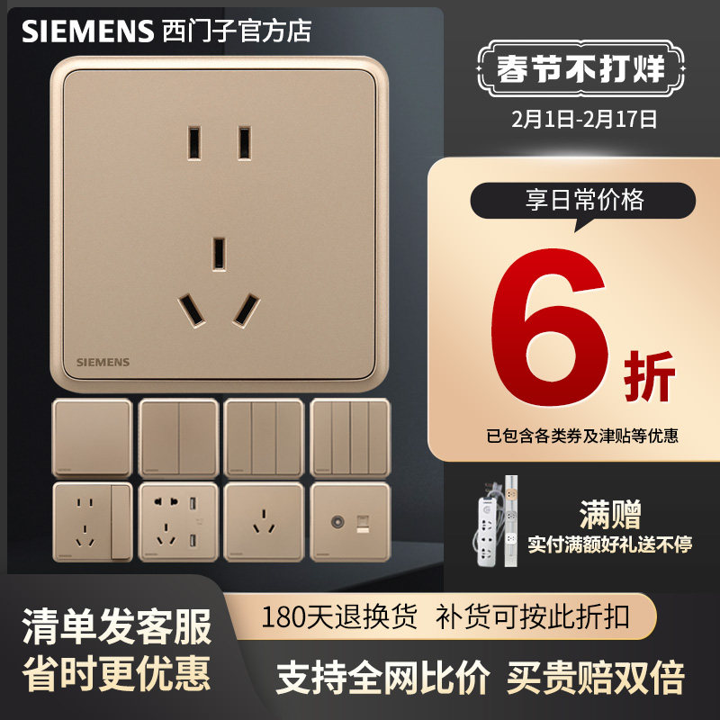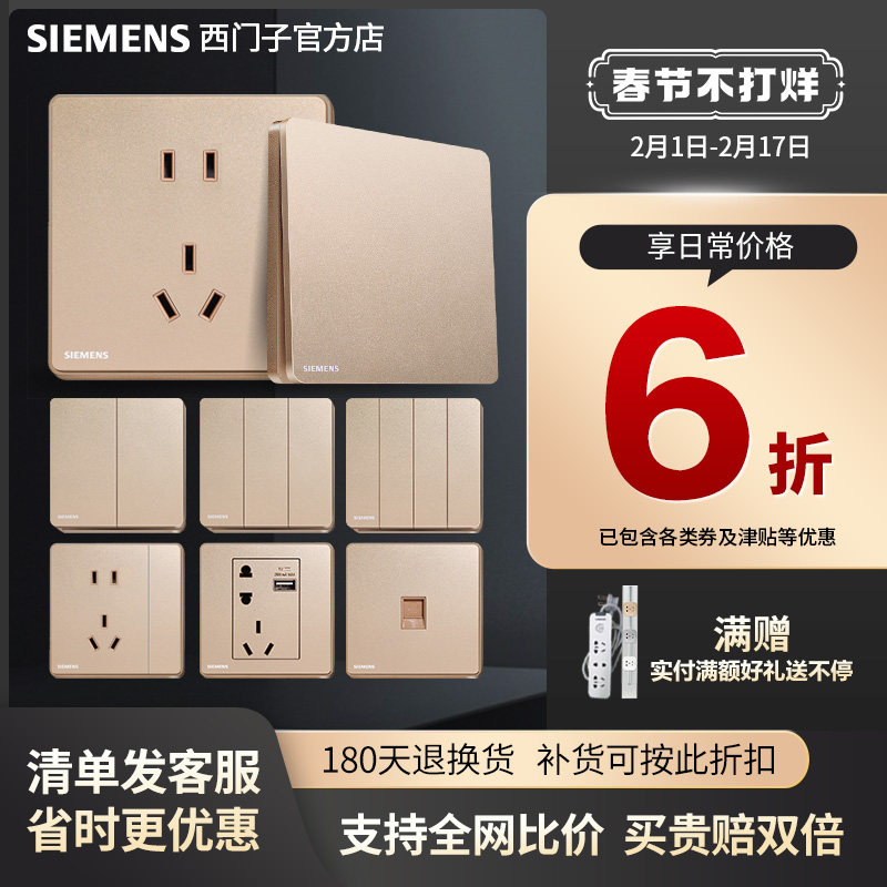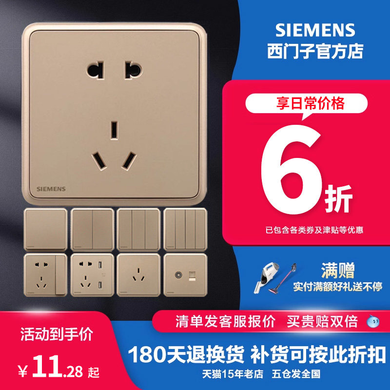 券 2元销量10西门子开关插座面板灵蕴日曜金香槟金五孔带86型墙壁多孔暗装套餐