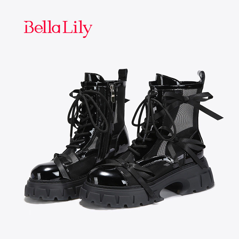 BellaLily新款镂空透气马丁靴女网纱薄款中筒靴厚底凉靴子