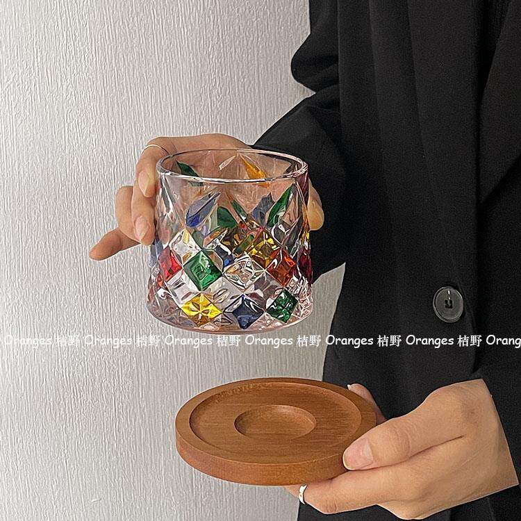 券 2元销量0折射彩虹光中古杯blingbling手绘冰川钻石玻璃水杯解压转转底酒杯