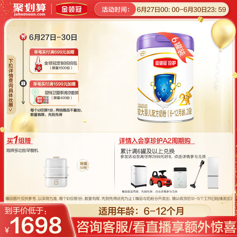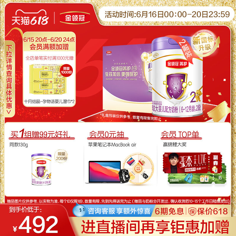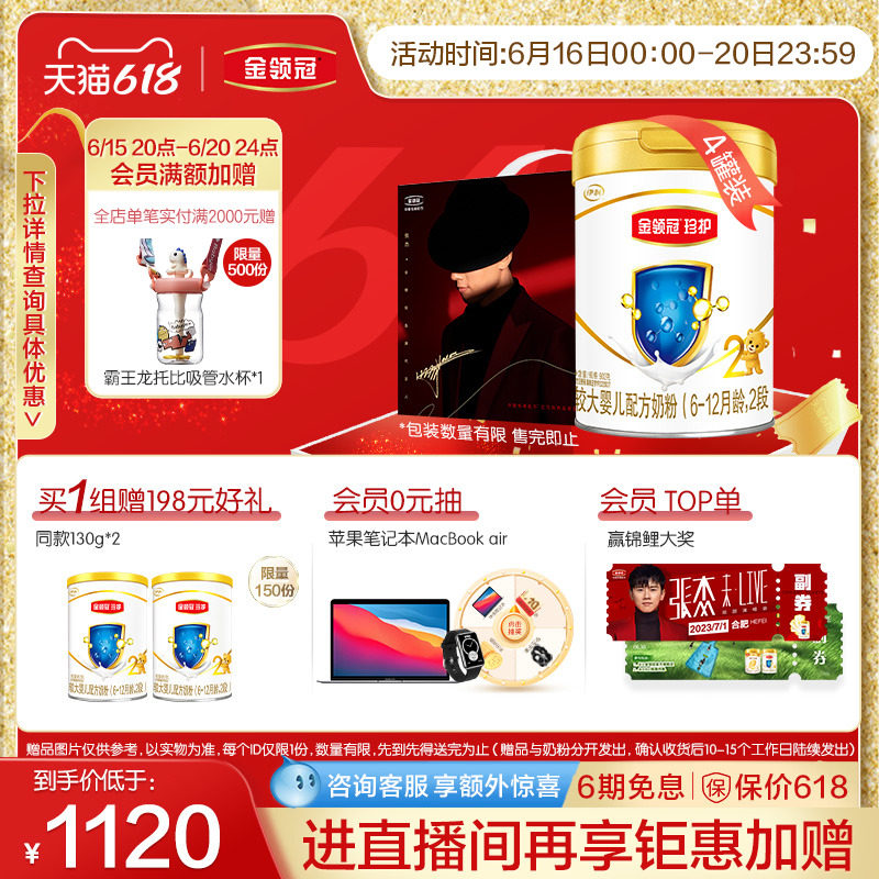 券 196元销量200【新国标】伊利金领冠珍护2段婴幼儿配方奶粉900g*6罐