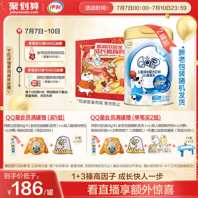 券 341元销量700伊利QQ星榛高4段3-12岁儿童成长高钙营养配方A2牛奶粉700g*2罐