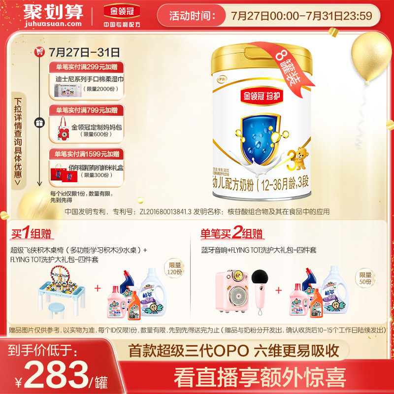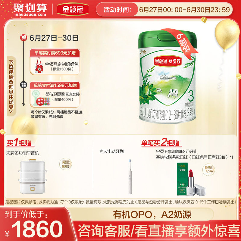 券 120元销量500【春节不打烊】伊利金领冠菁护3段婴幼儿A2配方牛奶粉800g*6罐
