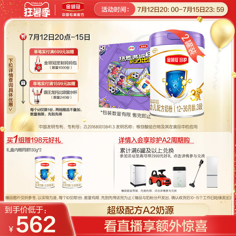 券 200元销量89伊利金领冠珍护A2奶粉3段幼儿配方牛奶粉808g*2罐