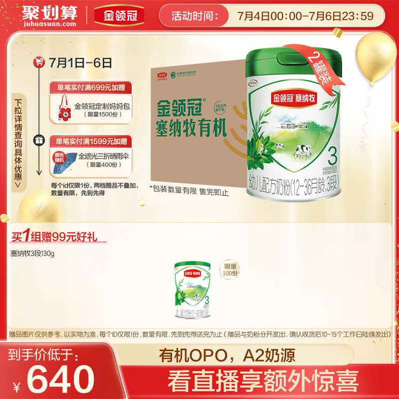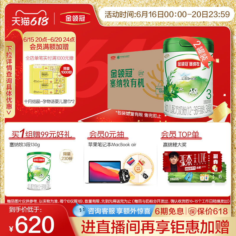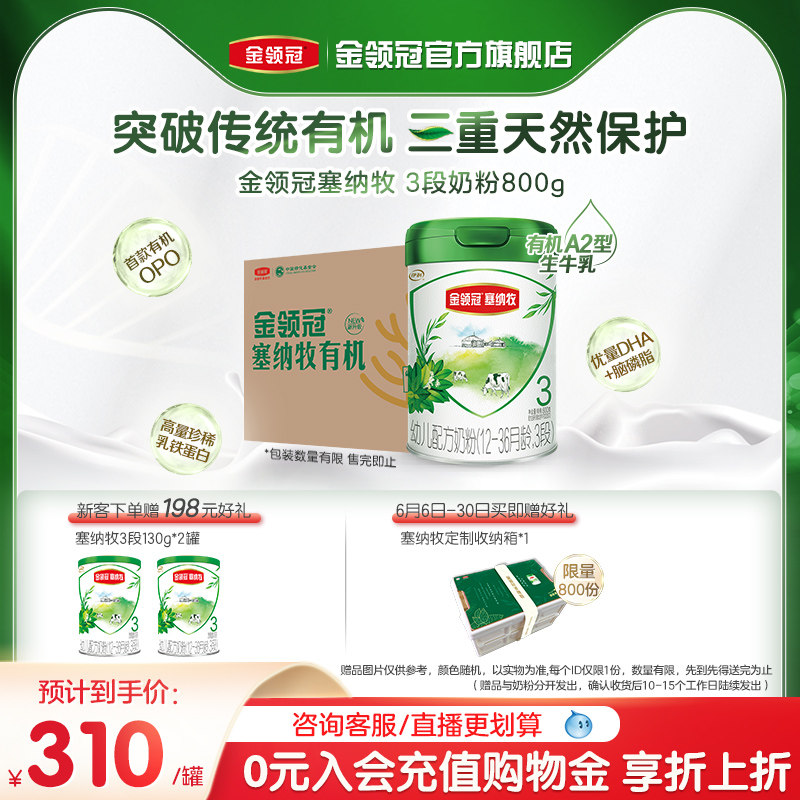 券 192元销量500【新国标】伊利金领冠塞纳牧3段有机牛奶粉800g*6罐