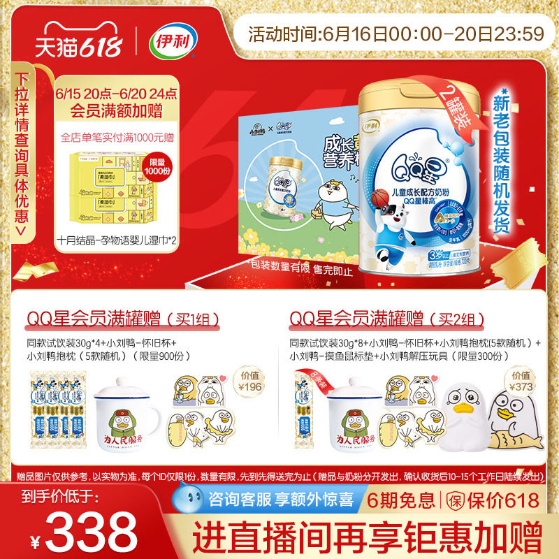 券 338元销量1000伊利QQ星榛高4段3-12岁儿童成长高钙营养配方A2牛奶粉700g*2罐