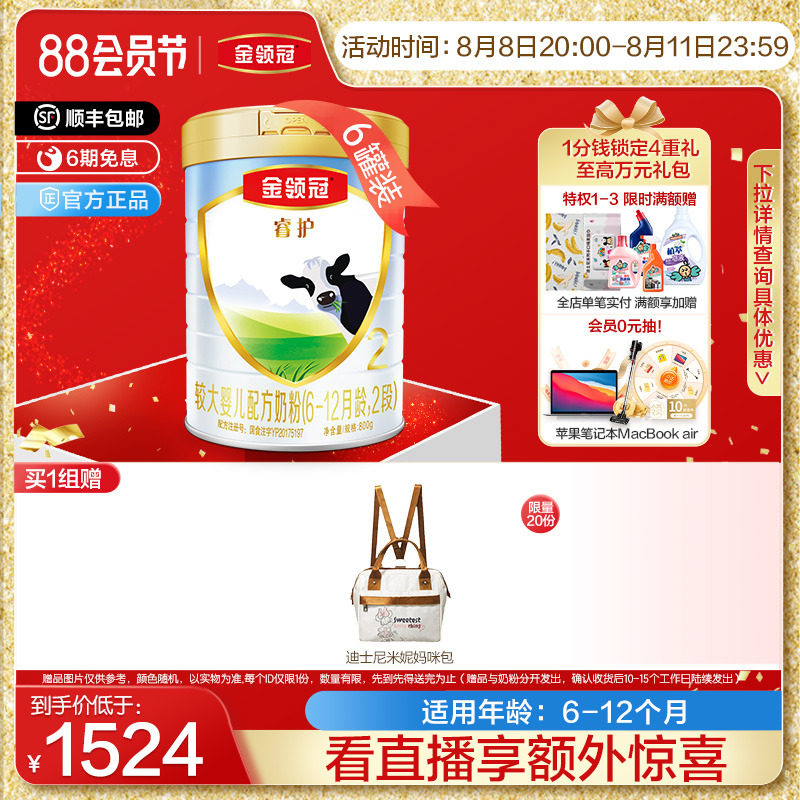 券 120元销量500【春节不打烊】伊利金领冠菁护2段较大婴儿配方牛奶粉800g*6罐