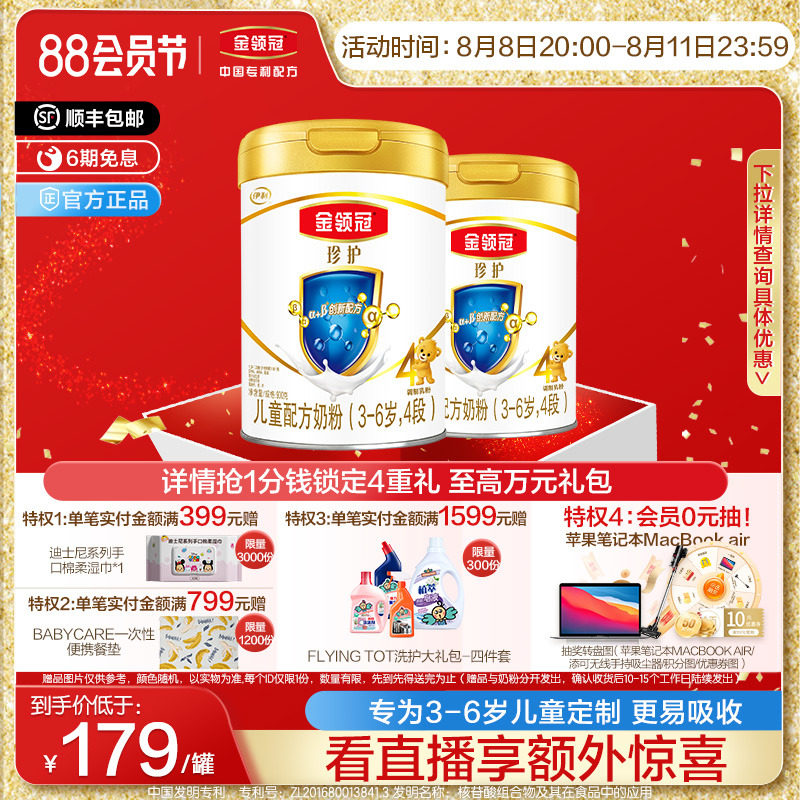 券 304元销量1000【会员专享】伊利金领冠珍护4段3-6岁儿童配方牛奶粉900g*2罐奶粉