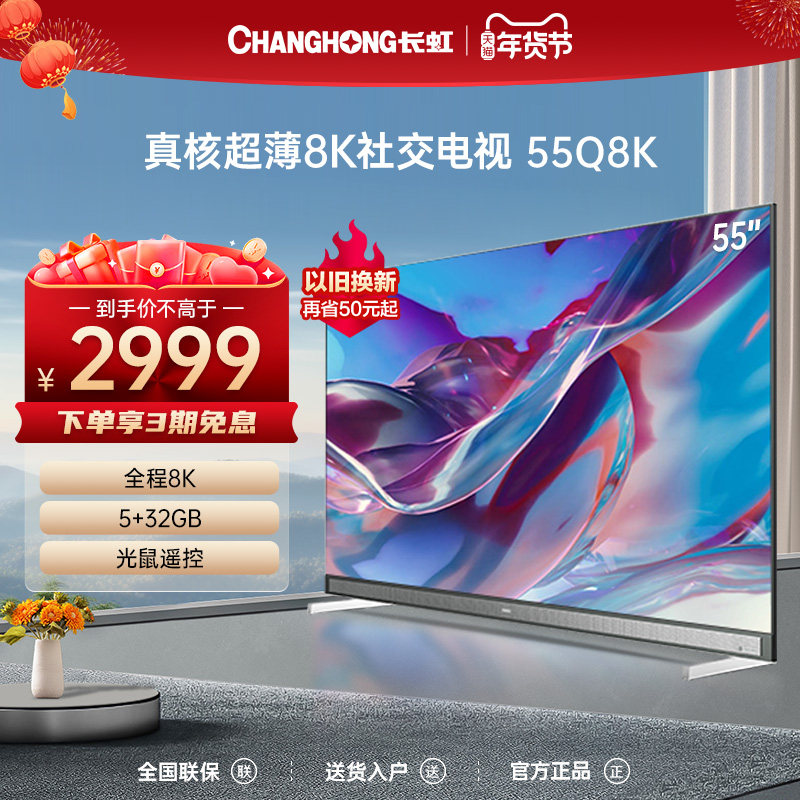券 1元销量4长虹55Q8K 55英寸真核超薄8K智能杜比视听社交正品官方家用电视机