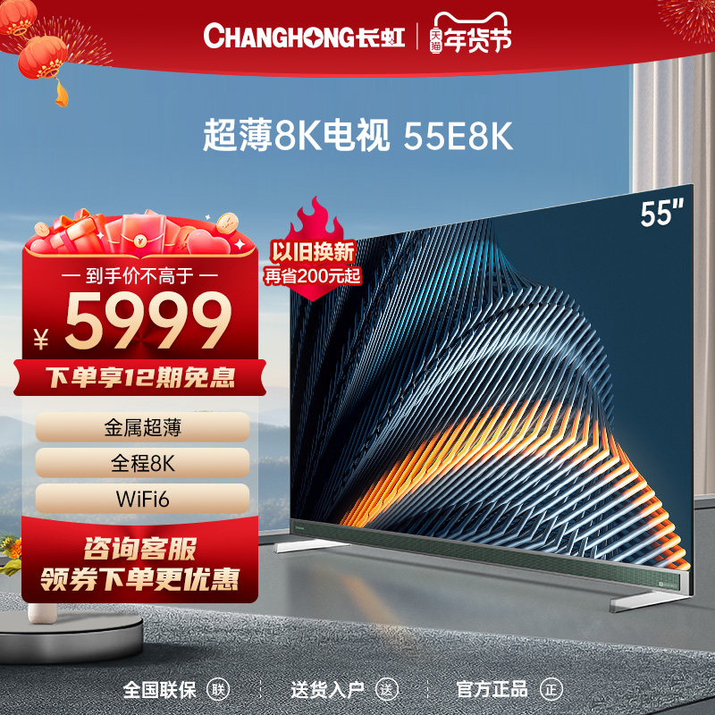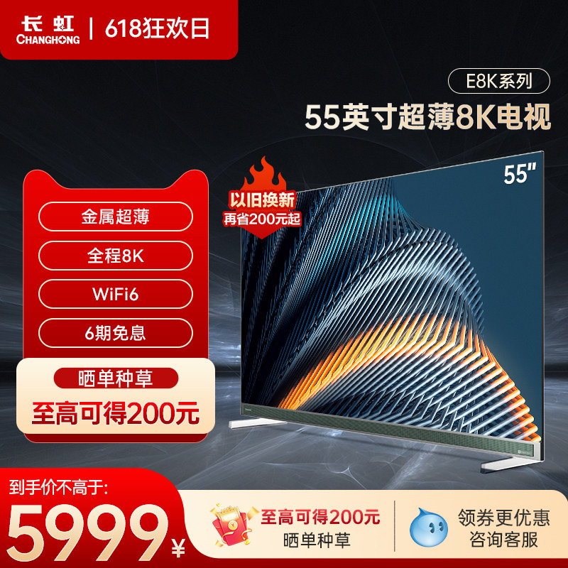 券 2000元销量0长虹55E8K 55英寸超薄8K杜比全景声远场语音5+32GB平板液晶电视机