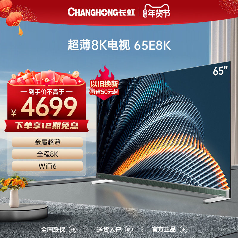 券 300元销量50长虹电视65E8K 65英寸超薄8K杜比全景声远场语音5+32GB电视机55