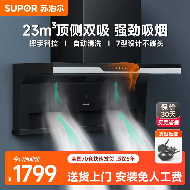 券 260元销量100苏泊尔顶侧双吸抽油烟机超薄7字型吸油机大吸力家用厨房排油畑机