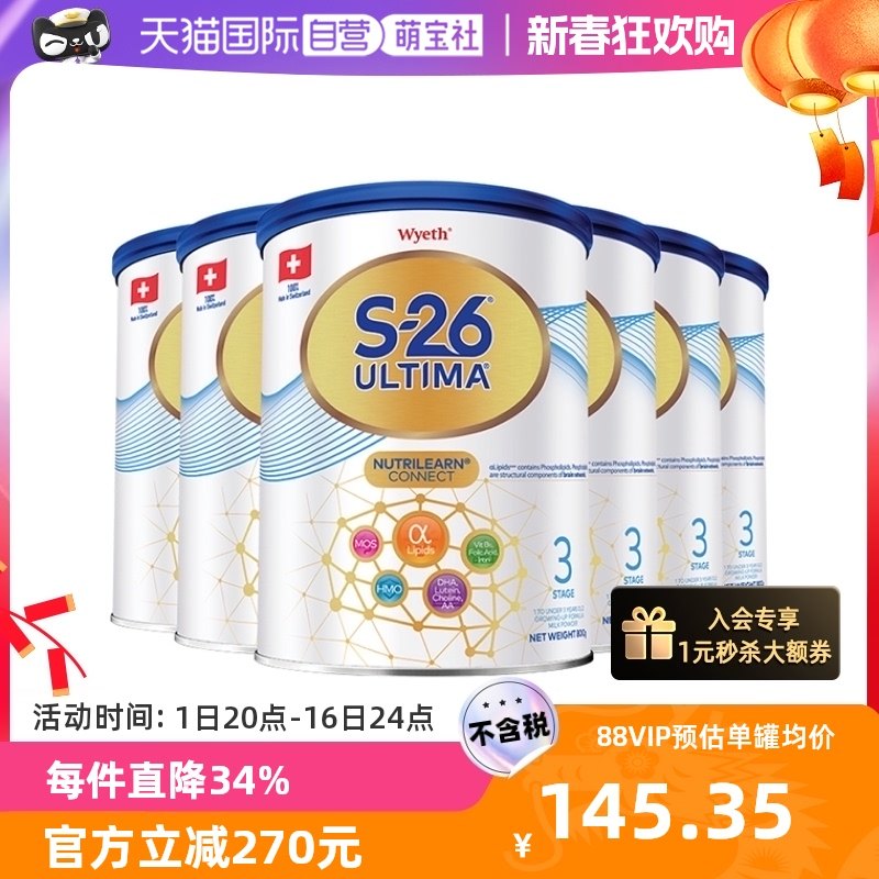 券 140元销量3【自营】惠氏港版铂臻S-26Ultima幼儿奶粉4段混合喂养800g*6