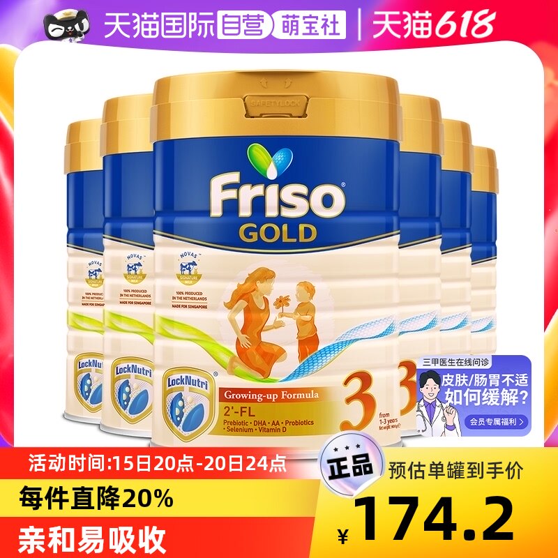 券 180元销量100【自营】荷兰Friso美素佳儿新加坡版成长配方奶粉3段 HMO900g*6罐