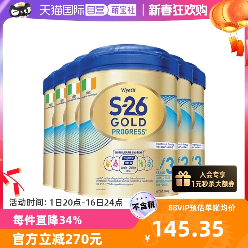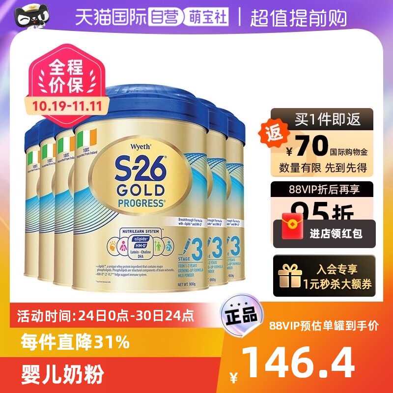 券 100元销量100【自营】Wyeth 惠氏S-26金装奶粉港版900g*6罐 3段进口配方幼儿乐
