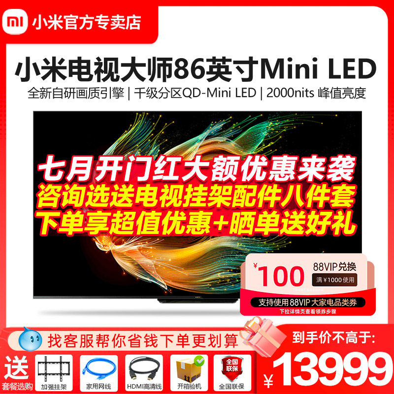 券 2110元销量10小米电视大师86英寸Mini LED全面屏电视机 4K智能平板液晶彩电