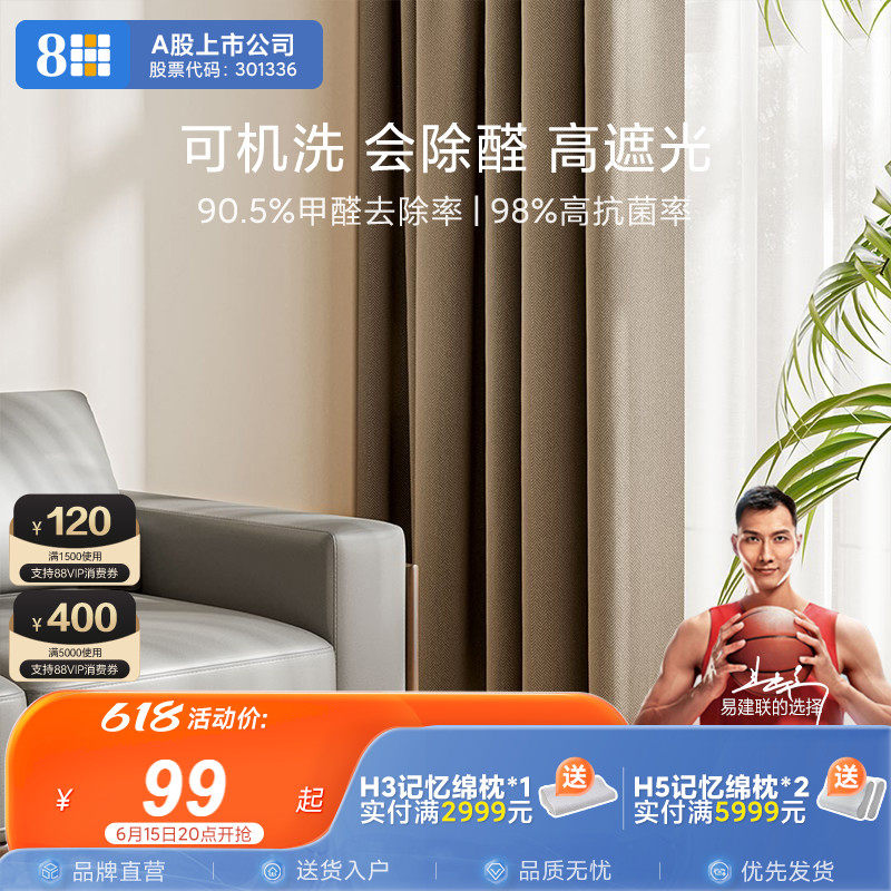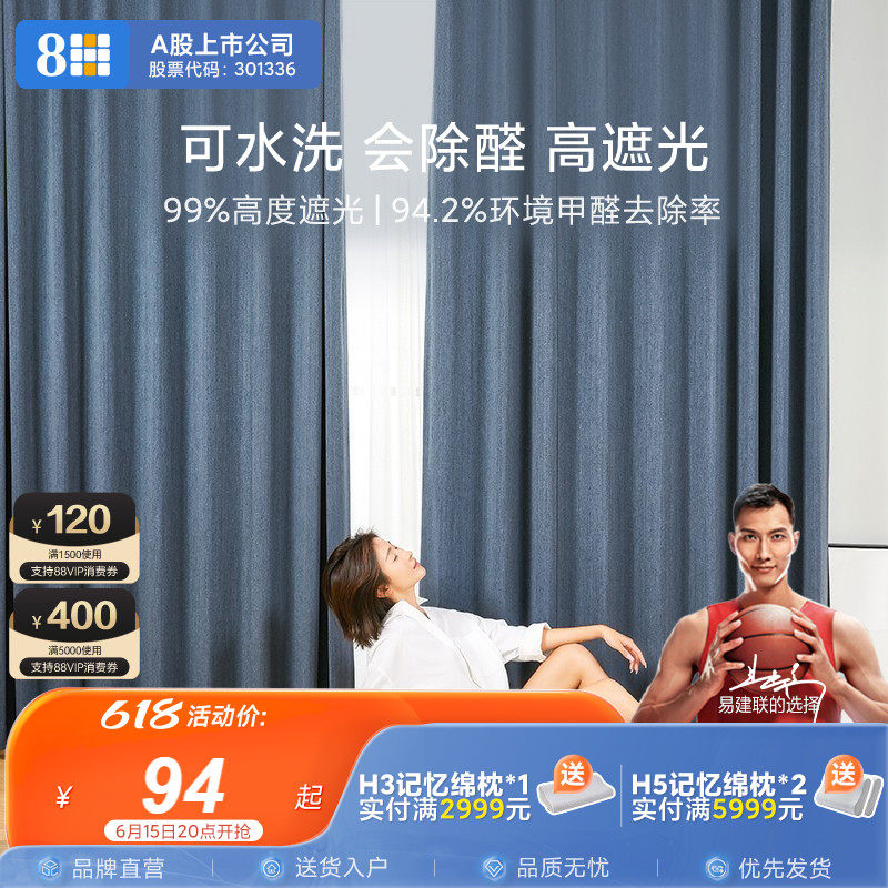券 200元销量98HSLEEP抗菌除甲醛全遮光窗帘卧室防晒隔热遮阳窗纱免打孔安装