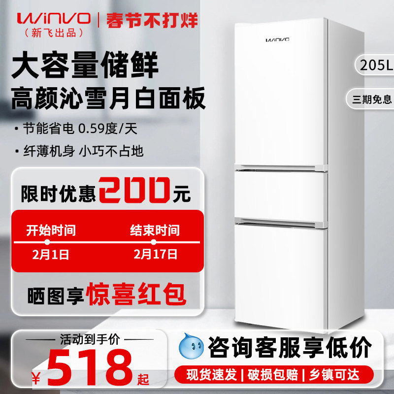 券 30元销量0新飞三门家用冰箱租房节能静音省电冷藏冷冻一级能效变频风冷无霜
