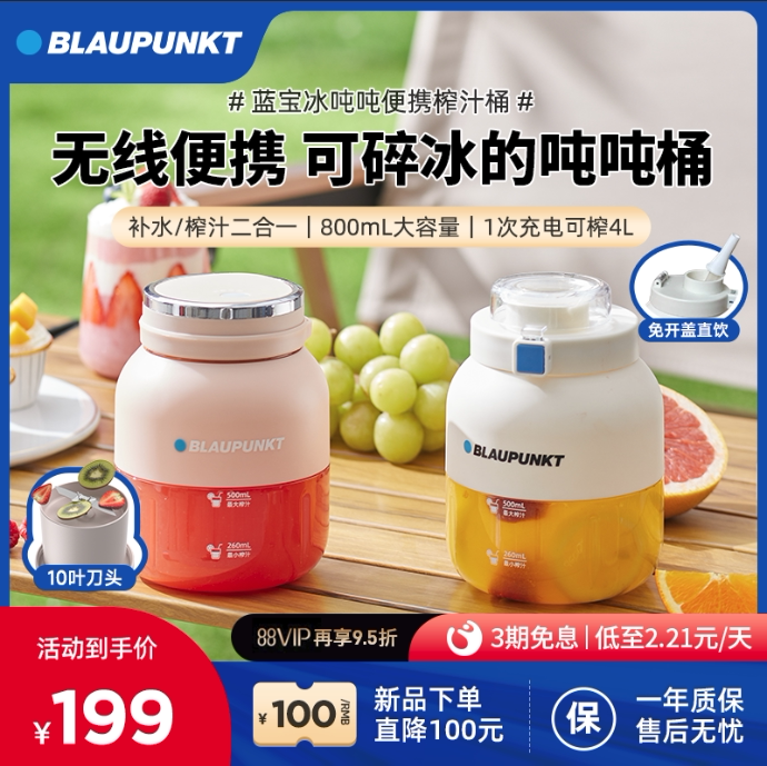 券 90元销量600蓝宝冰吨吨榨汁桶便携式榨汁机电动果汁杯家用小型果汁机原汁