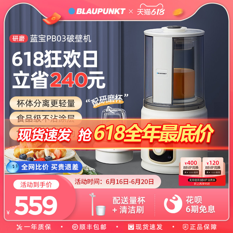 券 60元销量500蓝宝柔音破壁机家用榨汁机加热豆浆机研磨米糊多功能料理机非静音