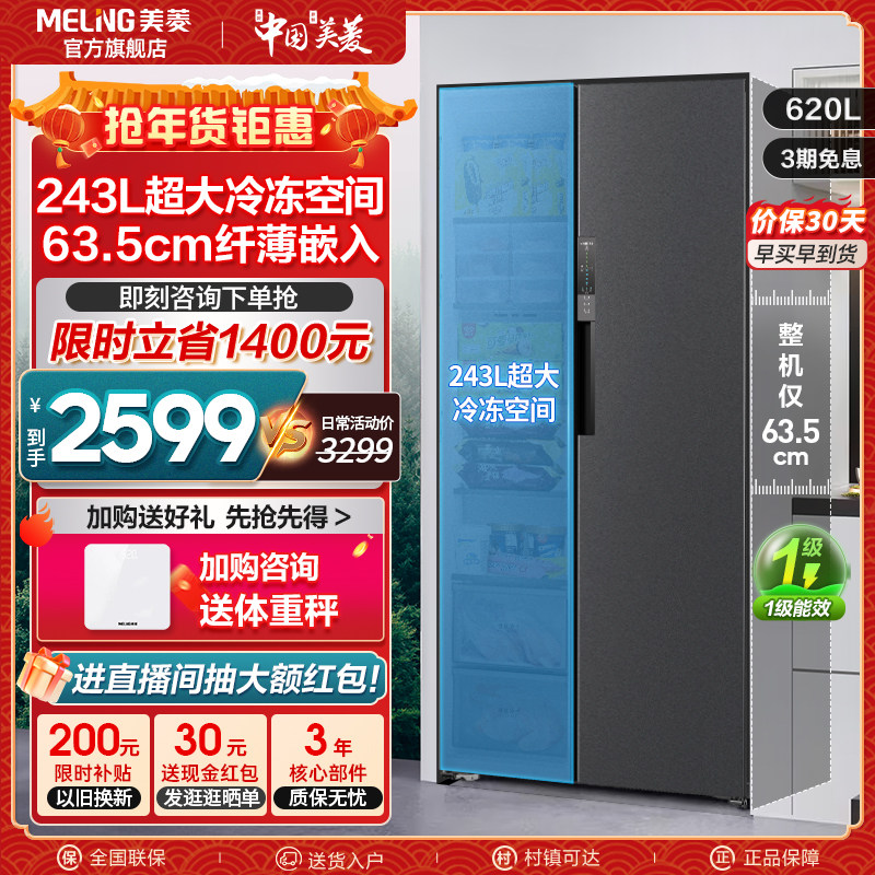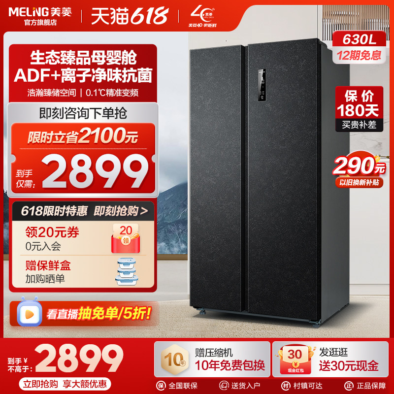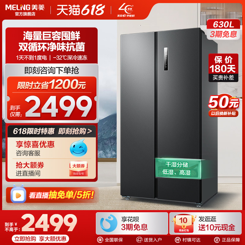 券 100元销量100美菱630L双开对开门双门大容量冰箱超大家用一级变频风冷无霜官方