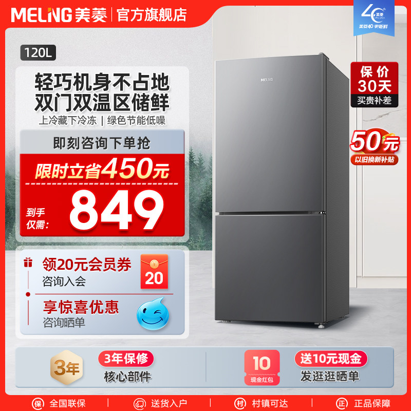 券 50元销量100美菱120L双门两门冰箱家用小型宿舍租房冷藏冷冻节能省电冰箱官方