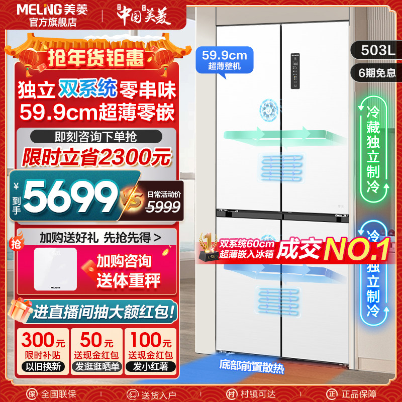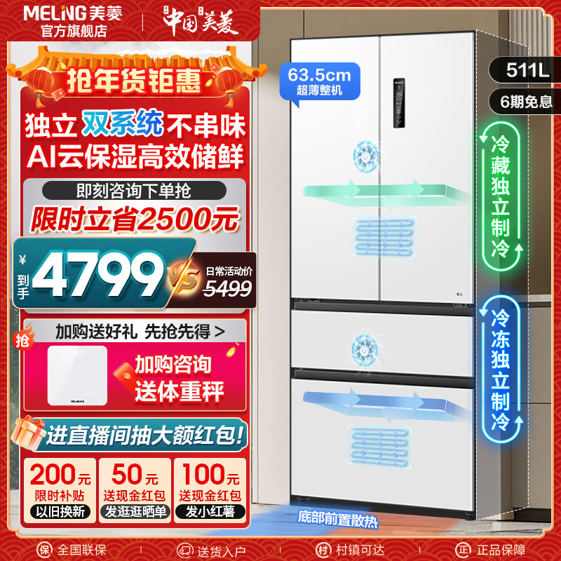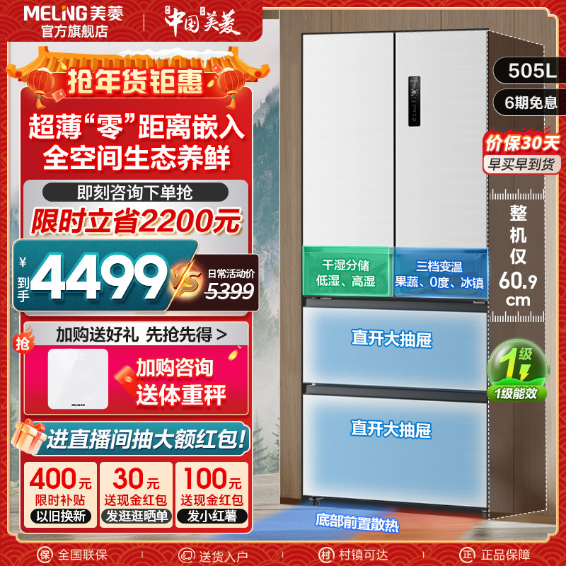 券 300元销量100新品美菱双系统循环超薄嵌入511L法式多门家用一级无霜大容量冰箱