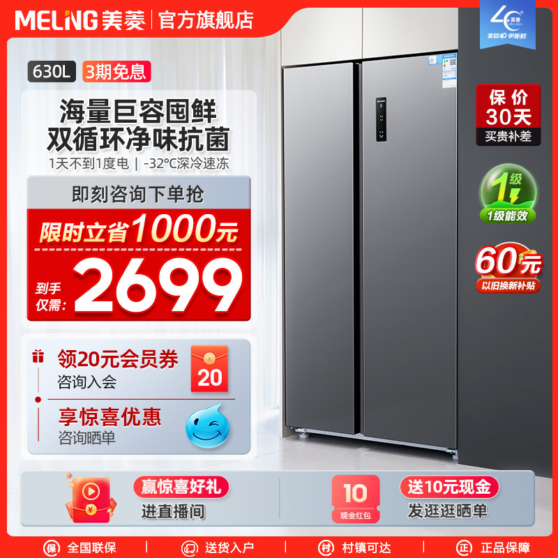 券 20元销量1000美菱630L双开对开门双门冰箱家用大容量一级节能变频风冷无霜官方