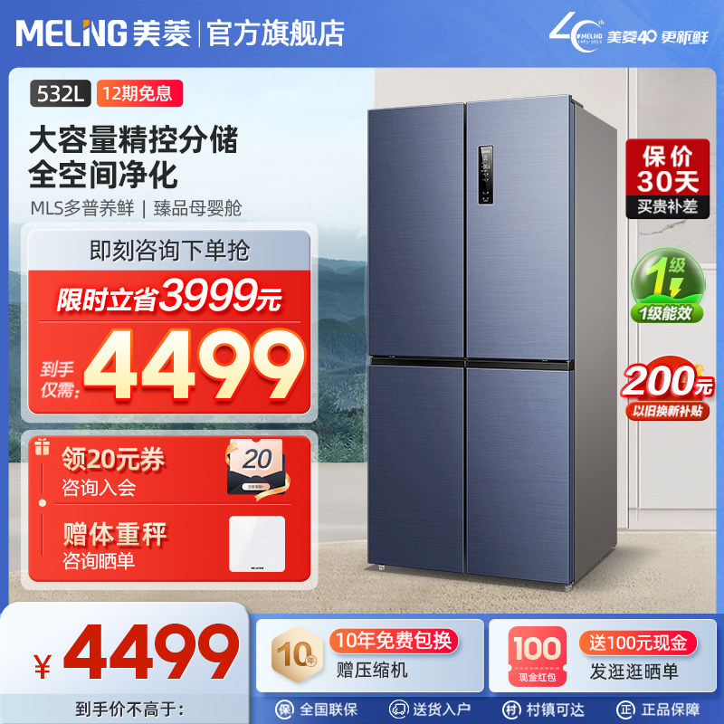 券 20元销量40【M鲜生】美菱532L十字对开四门一级变频智能家用大容量无霜冰箱