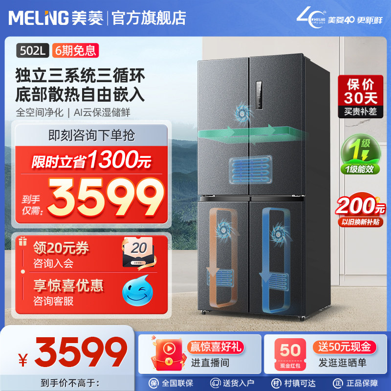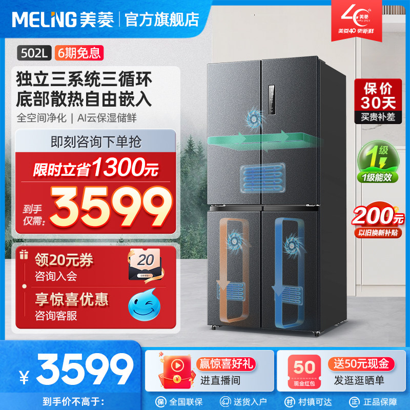 券 20元销量400三系统冰箱美菱官方502L超薄嵌入式家用十字双开对开四门一级无霜