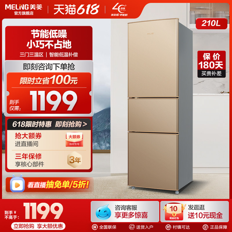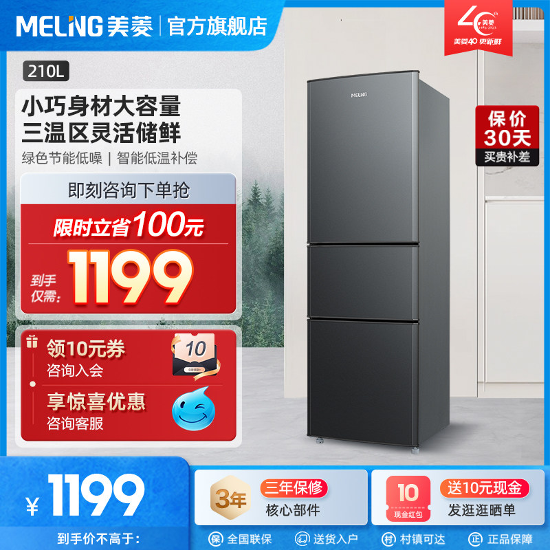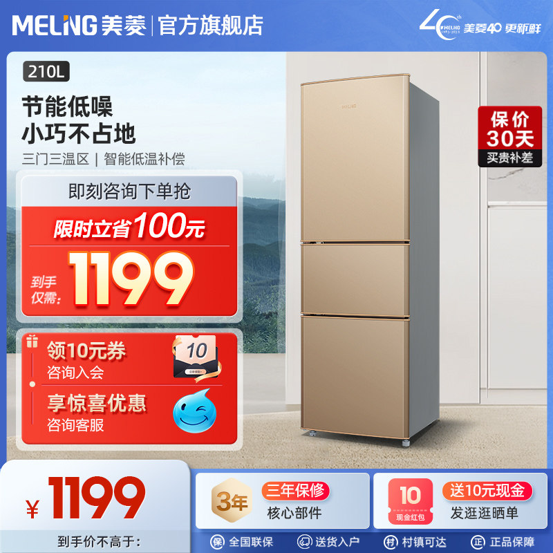 券 50元销量100鲜食尚美菱210L三门三开门家用小型节能省电租房宿舍冷藏冷冻冰箱