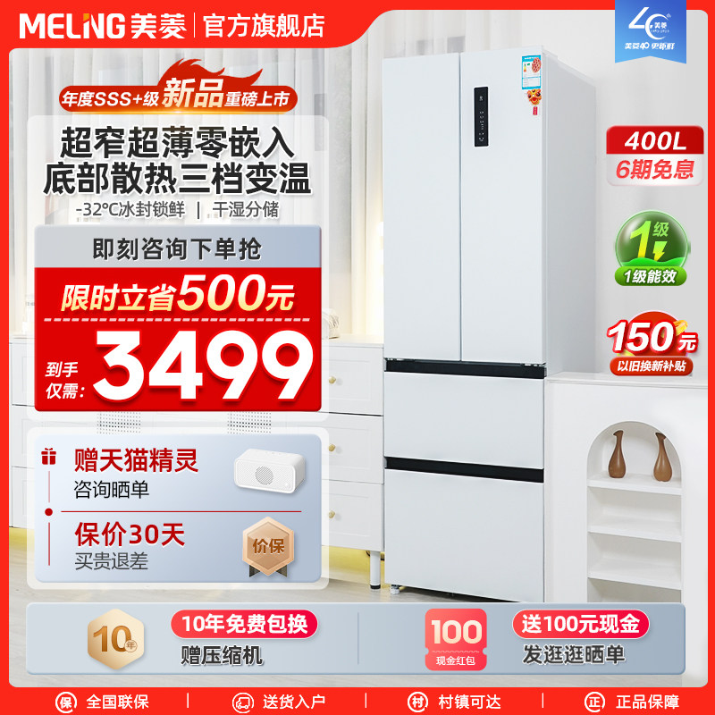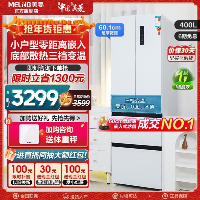 券 20元销量300新品美菱官方400L超薄零嵌入冰箱法式多门一级家用四门白色旗舰店