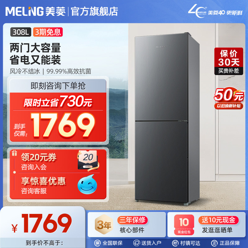券 20元销量300美菱官方308L双门双开门家用小型冰箱租房宿舍节能风冷无霜大容量