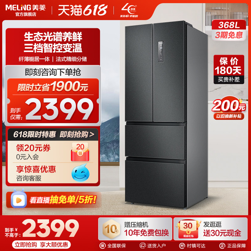 券 20元销量100光谱养鲜美菱368升家用冰箱法式多门双开四开门超薄一级无霜官方
