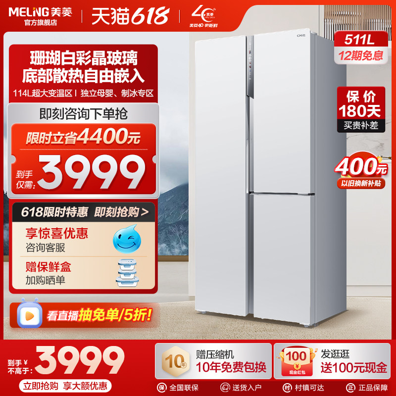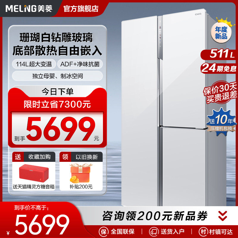 券 20元销量100美菱511L家用超薄杀新冠冰箱嵌入式大容量多门对开门一级白色玻璃