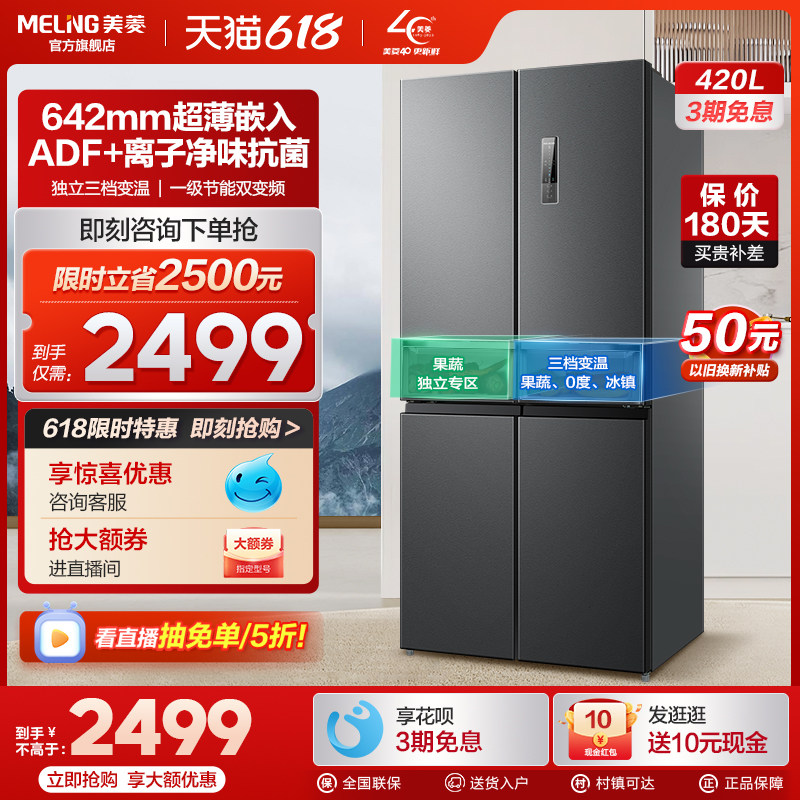 券 50元销量100美菱420L电冰箱十字对开四门无霜一级节能变频家用大容量超薄官方