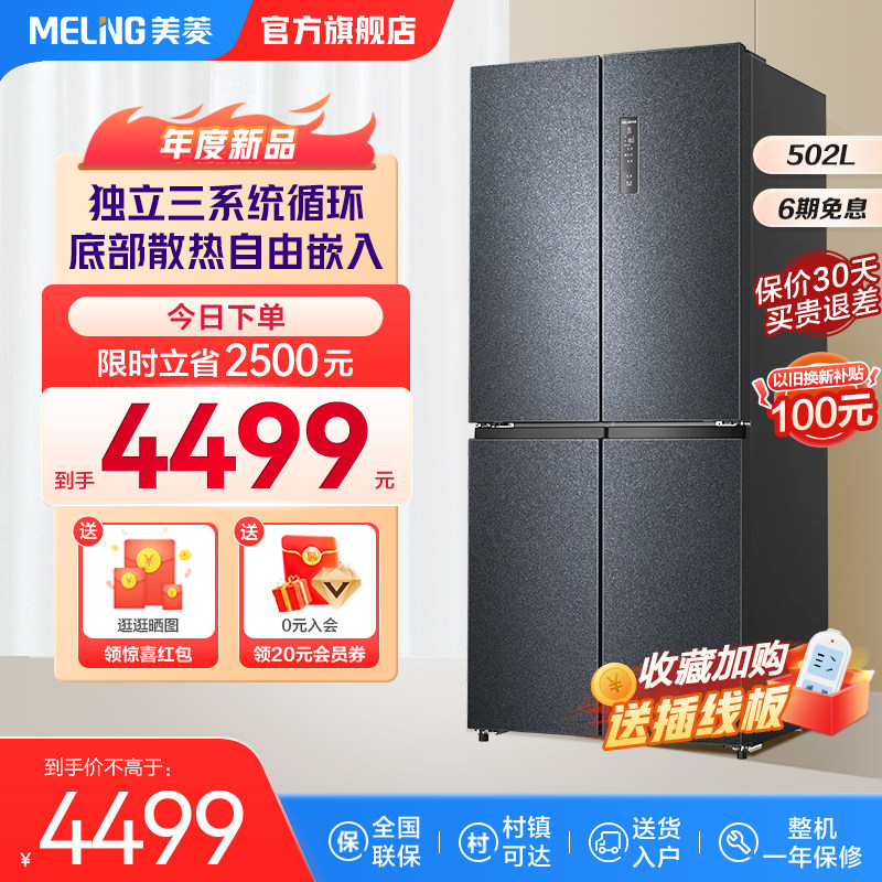券 20元销量300三系统冰箱美菱官方502L超薄嵌入式家用十字双开对开四门一级无霜