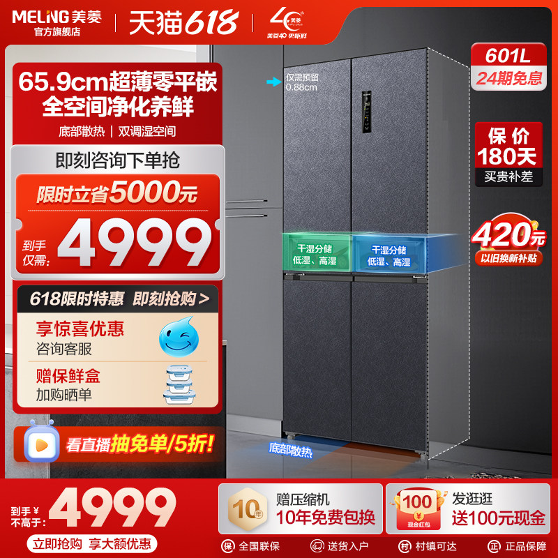 券 100元销量100美菱官方超薄嵌入冰箱601L十字对开门四门双门大容量家用一级无霜