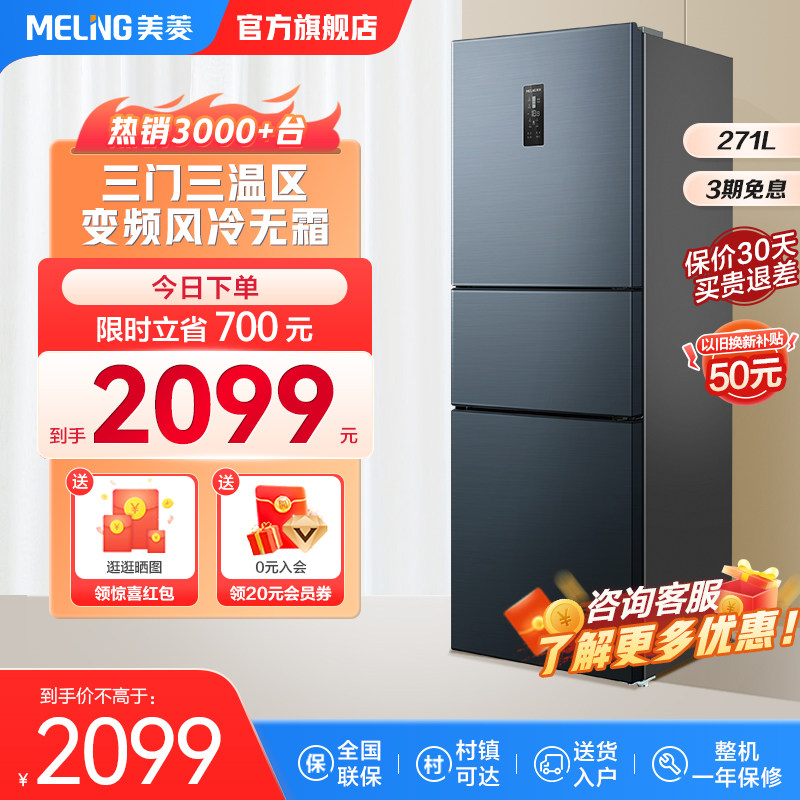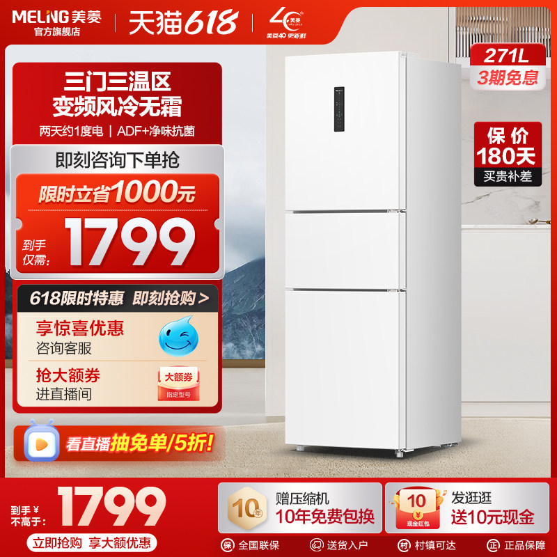 券 20元销量1000美菱官方白色冰箱271L纤薄三门家用小型无霜一级变频节能租房宿舍
