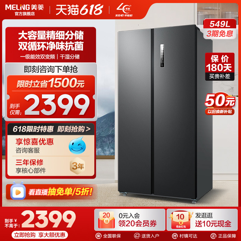 券 20元销量100离子净美菱电冰箱官方549l对开双开门无霜家用大容量一级变频智能