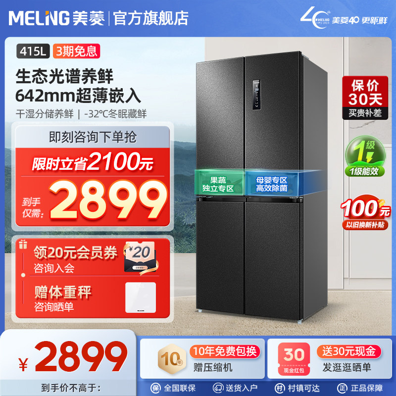 券 20元销量51光谱养鲜美菱415L家用嵌入式超薄母婴十字对开四门无霜变频电冰箱