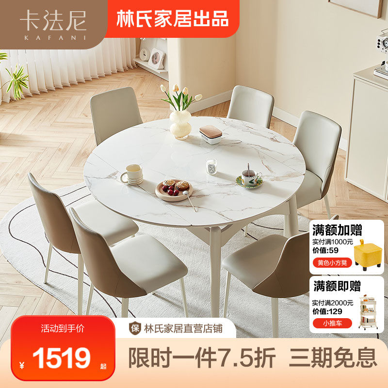 林氏木业轻奢奶油风伸缩岩板餐桌方可变圆桌子小户型家用圆形饭桌