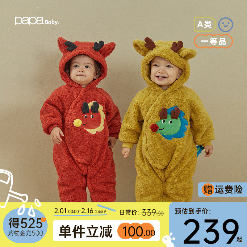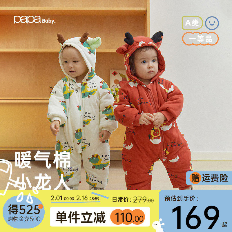 券 10元销量100papa冬季龙年婴儿夹棉连体衣男女宝宝爬服外出保暖