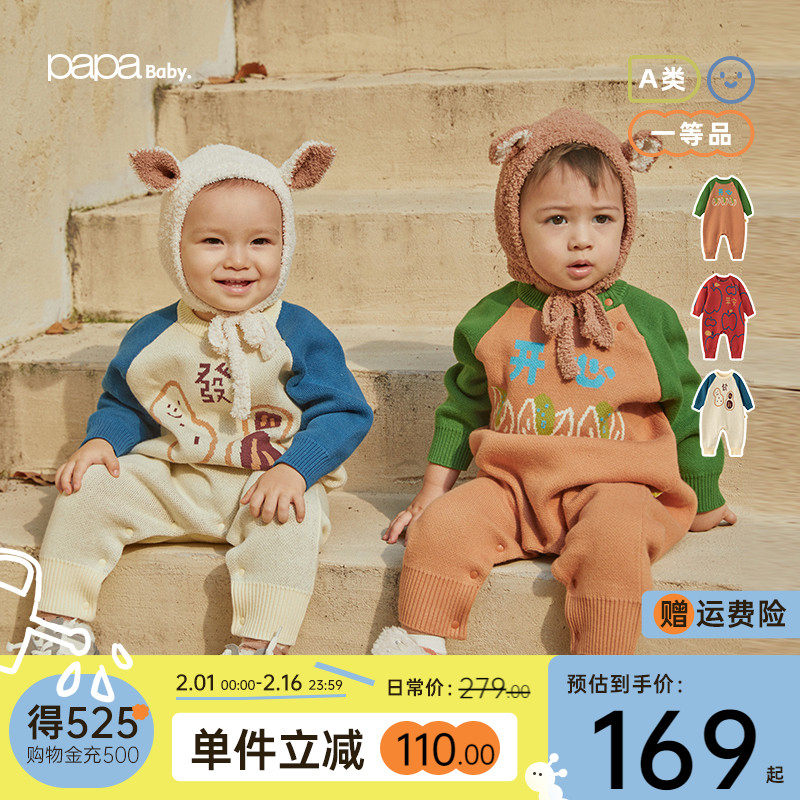 券 10元销量100papa爬爬秋冬装婴儿毛衣连体衣男女宝宝针织爬服新年外出保暖纯棉