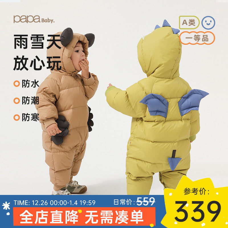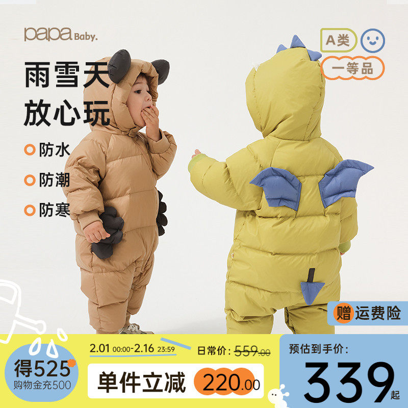 券 10元销量500【放心绒】papa爬爬冬新款男女宝宝羽绒服婴儿连体衣外出保暖超萌